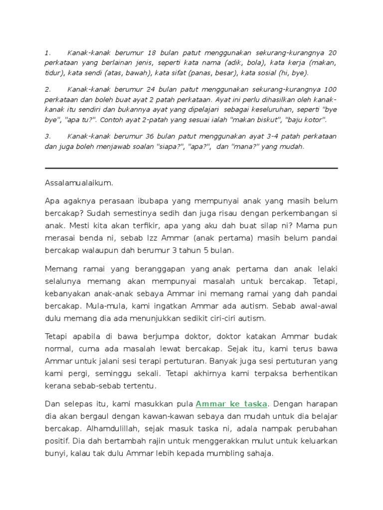 Anak umur 2 tahun boleh sebut 2 3 patah perkataan yang digabungkan. Akan tetapi terdapat juga sesetengah anak yang masih tidak pandai bercakap walaupun sudah berumur tiga tahun. Kanak kanak sukakan barang dapur. Tanda tanda anak lambat bercakap anak umur setahun boleh sebut 1 patah perkataan.