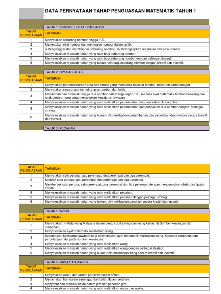 Data Pernyataan Tahap Penguasaan Matematik Tahun 1 Ainiiiii